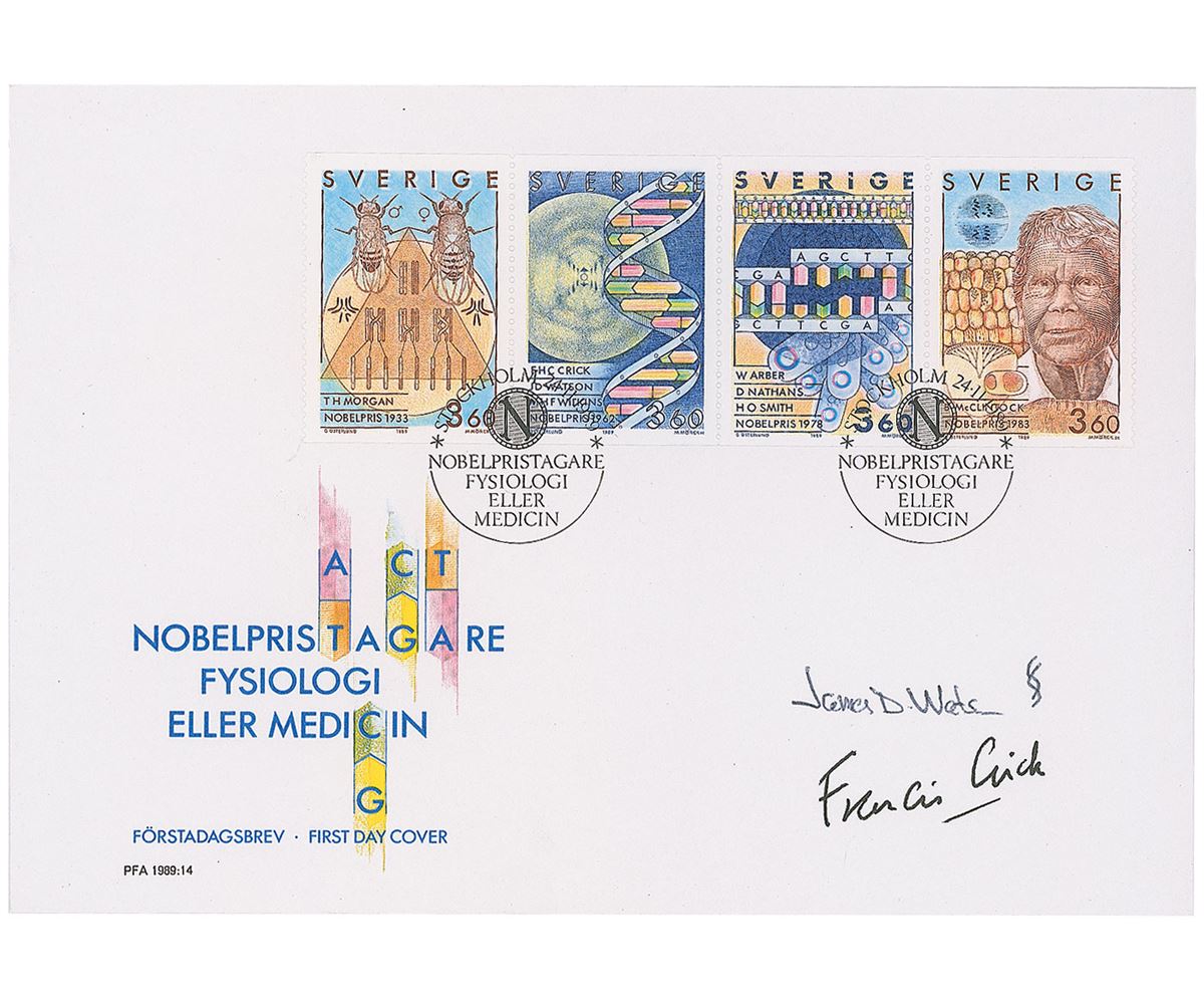 Commemorative cover, 7 x 4.75, honoring the Nobel Prize for “Fysiologi Eller Medicin,” signed in black ballpoint by Watson, adding a small sketch of a double helix, and in black felt tip by Crick. In fine condition. The commemorative cover also features four Swedish stamps, all featuring Nobel Prize winners in physiology and medicine, including Watson and Crick.