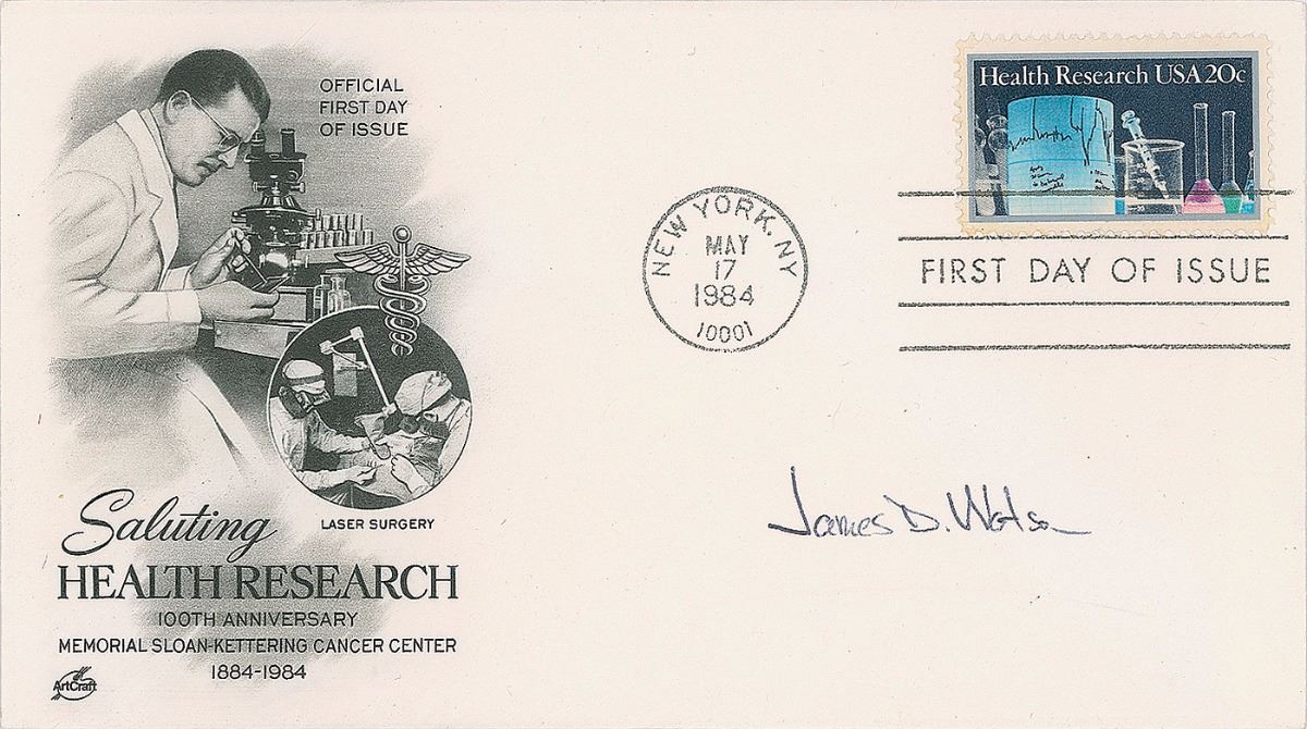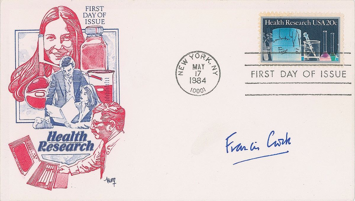 Two FDCs: one with a cachet honoring the 100th anniversary of the Memorial Sloan–Kettering Cancer Center, signed in black ballpoint, “James D. Watson,” and the other bearing a cachet honoring health research, signed in blue ink, “Francis Crick.” In overall fine condition.