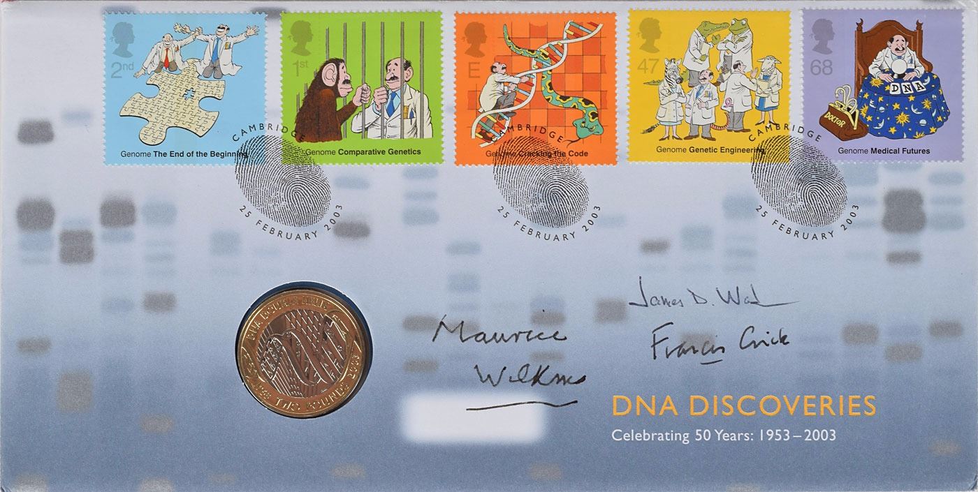 Limited edition Royal Mint and Mail coin and commemorative cover honoring 50 years of DNA Discoveries: 1953–2003, 8.5 x 4.25, one of 30,000 issued, signed in black ballpoint, "James D. Watson," and in black ink, "Francis Crick," who also signs "Maurice Wilkins." In fine condition.