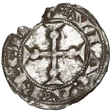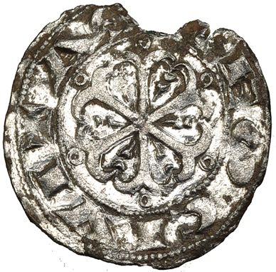 DOÑA URRACA. Dinero. León. A/ Cruz; *VIACA*REGI(-). R/ Cruz floreada de seis brazos, en los espacios, crecientes sobre bástagos y en el final de los brazos seis roeles; (L)EO CIVITAS. Falta fragmento. MBC+. Inédita.