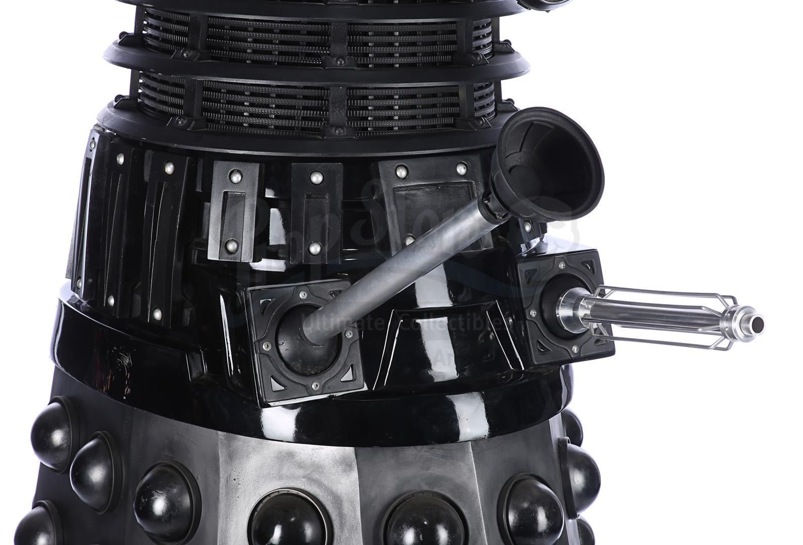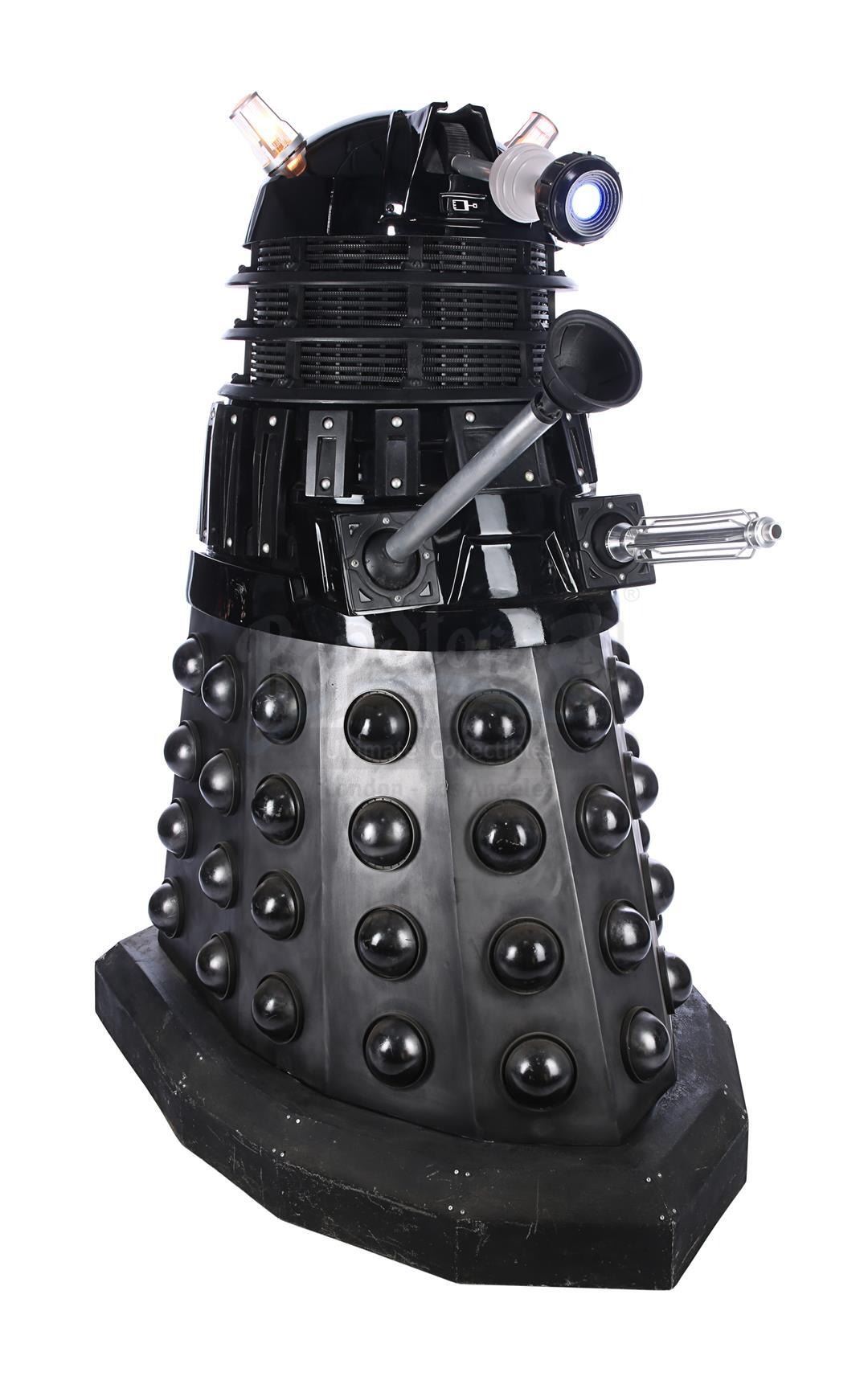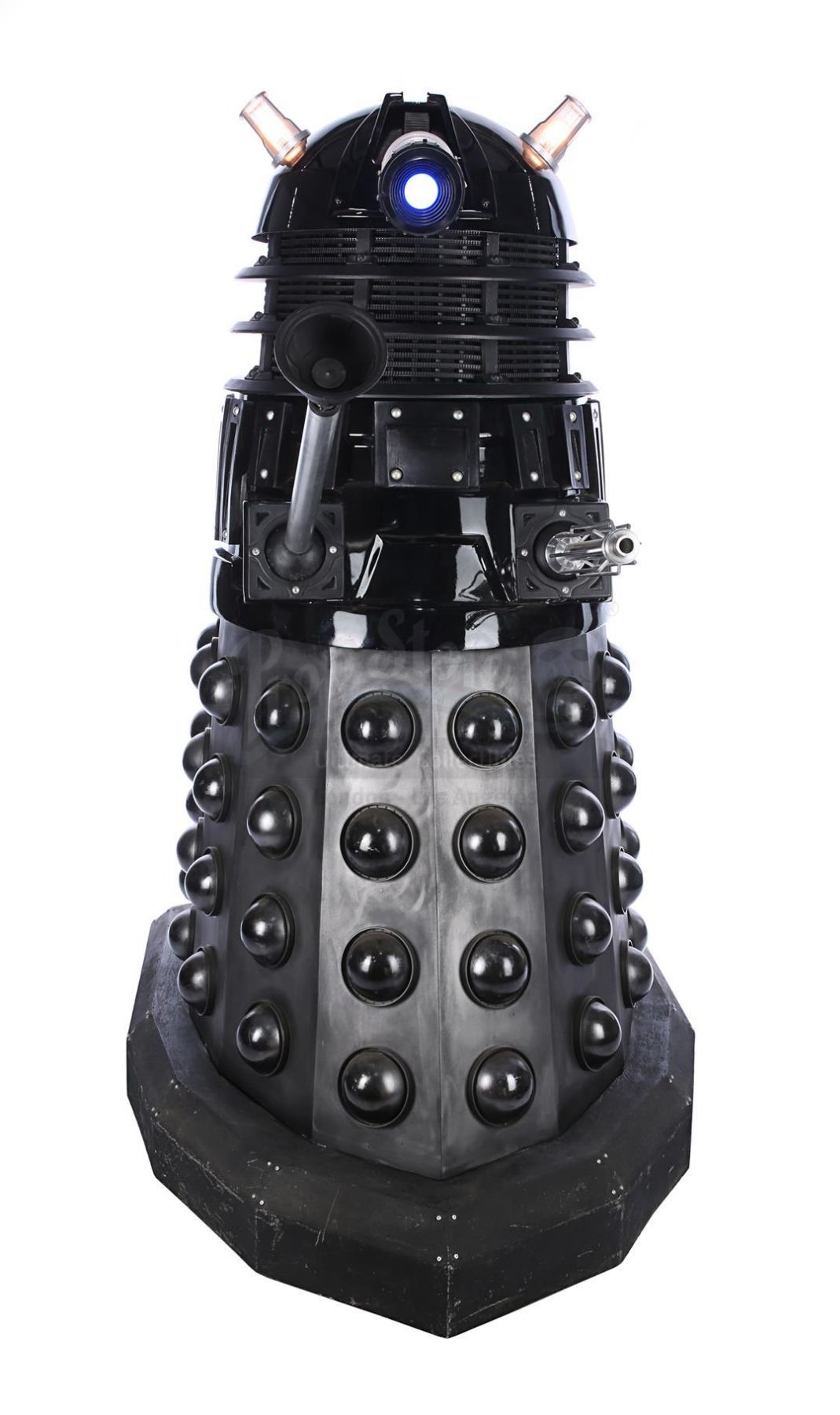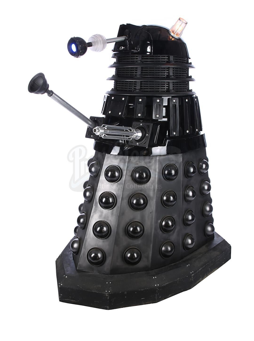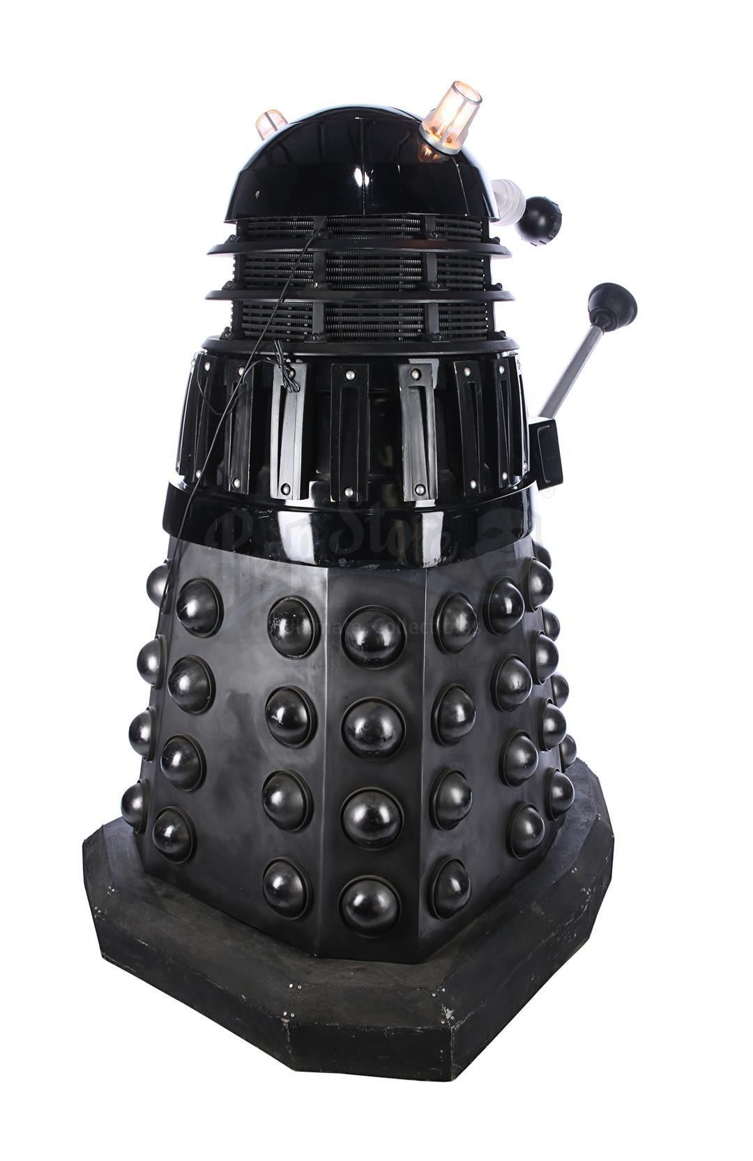 The full-size model is constructed from a combination of cast resin and fibreglass, with grill detailing around the neck and hemispheres on the skirt. The body is predominantly black with a silver-coloured metal eye stalk, gun stick and an extendable plunger rod. A small switch is present on the rear of the dome that controls the eye stalk's blue light, and the two dome lights illuminate when the switch of its cabelled hand controller is pressed. The lights are powered by a 12v battery within the neck cage. The model is accompanied by an additional functional remote control box (powered by 8 AA batteries) and power unit, used to control the dome section's rotation, which was achieved via radio control servos. The Dalek displays scuffing on the base from previous handling and there is notable scratching and paint wear on the right side of the body, revealing the original gold-coloured paint. Dimensions: 125 cm x 95 cm x 165 cm (49 1/4" x 37 1/2" x 65")