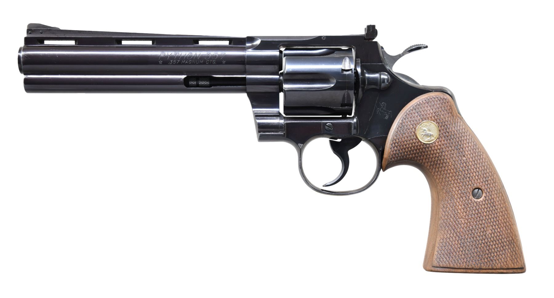 DA REVOLVER WITH FACTORY LETTER. Cal. 357 Mag. S# 256. Mfg. 1955, as one of only 299 revolvers produced in the first year. Bbl. 6" w/ vent rib & full length ejector shroud. Ramp front sight w/ orange insert & Accro square notch white outline rear sight. Six shot fluted cyl. High polish Royal Blue finish. Hammer has polished sides. Early fully checkered walnut grips w/ gold rampant colt medallions. UNATTACHED ACCESSORIES: Colt factory letter stating the following: "Serial Number: 256 / Caliber: .357 Magnum / Barrel Length: 6" / Finish: Royal Blue / Type of Stocks: Not Listed / Shipped To: Stratton Baldwin Company, Inc. 700 Tchoupitoulas Street New Orleans, Louisiana / Date of Shipment: November 16, 1955 / Number of Same Type Guns in Shipment: 1". CONDITION: balance of metal parts retain over 98% original blue, custom added groove has been inletted into top of vent rib. Cyl. has a light drag line, right sideplate has a light scratch. Grips show finish & checkering wear w/ small dents at butt. Tight sound action. Bright near excellent bore. (25-559/DS). CURIO. $8,500-12,500.