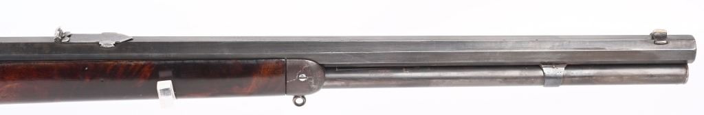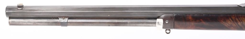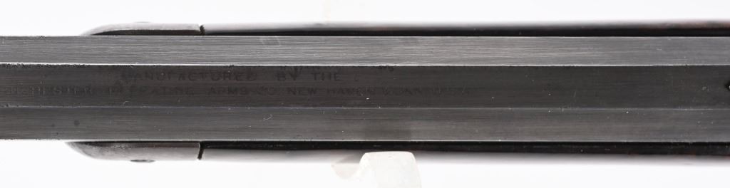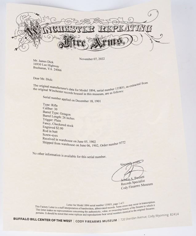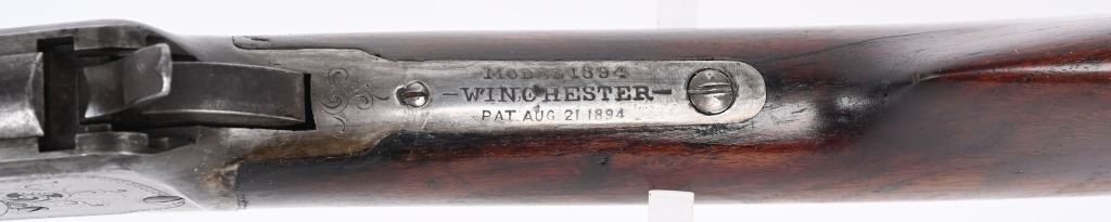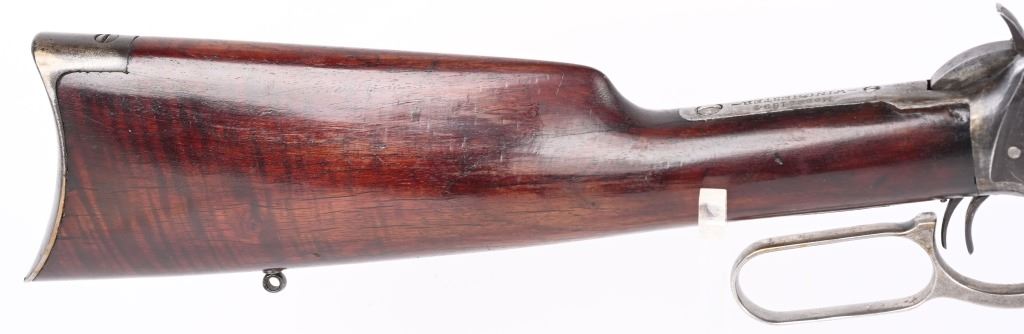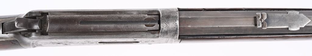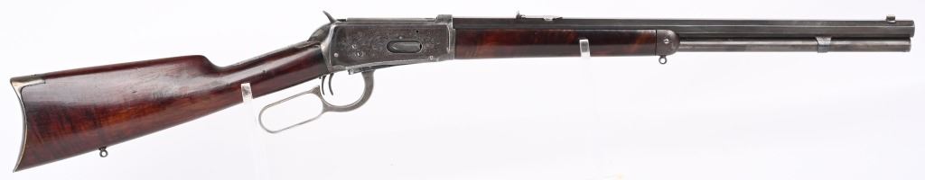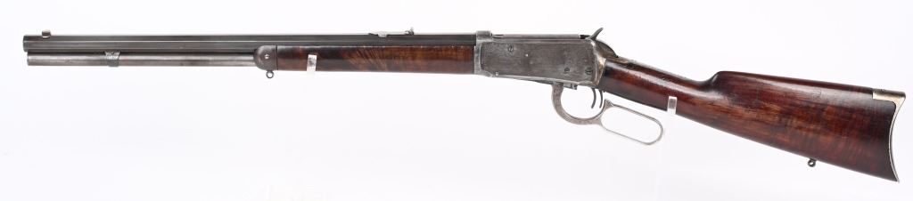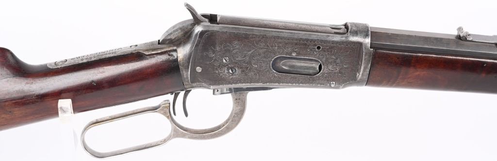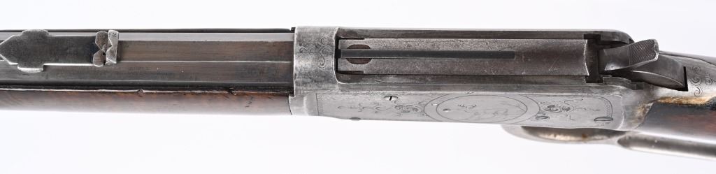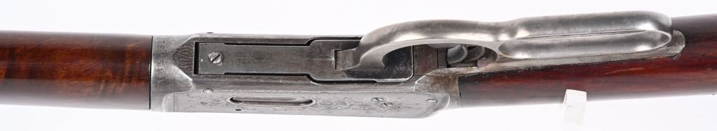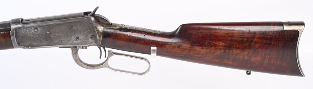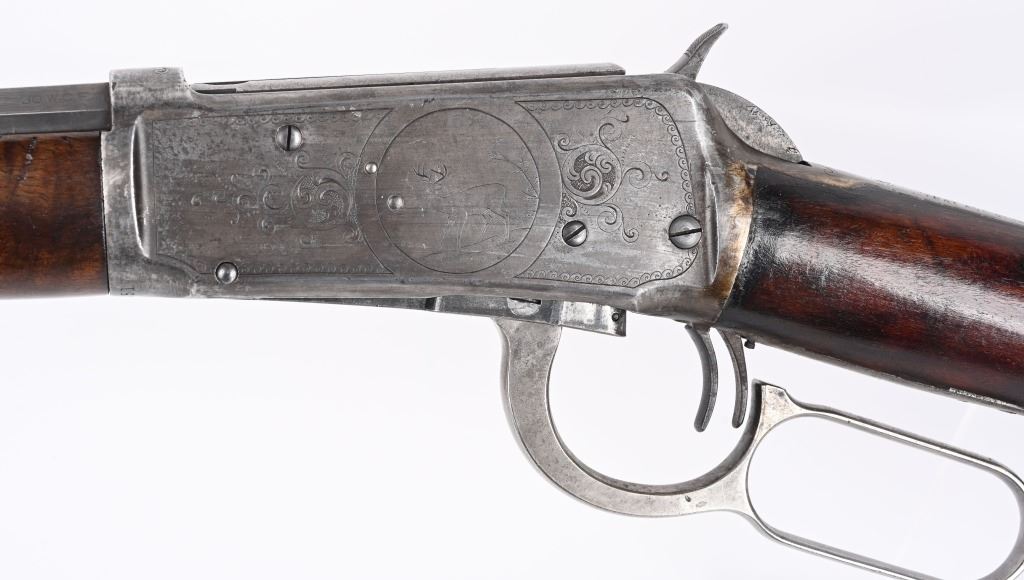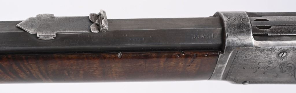 SERIAL NUMBER 135851 BARREL 20" CALIBER 30 WCF MANUFACTURED 1901. Blue finished with octagon barrel and full magazine. Highly figured walnut stocks with Sporting blade front sight and 2 leaf express rear sight. Double set triggers, Factory engraved with a game scene vignette of a standing buck deer with trees in the background and a chiseled rope border surrounding the sides of the frame and light scroll on top of receiver and to rear of hammer. Rifle has has some changes in its configuration since leaving the factory as is indicated by the letter. That indicates cal 30 WCF Octagon barrel 26 inches with plain trigger and fancy checkered stock, $2.00 engraved, rod in butt and factory sling eyes. CONDITION. Good bore and properly operating action. Engraving is crisp and fine. Finish has toned to a mottled period patina. Stocks have wear and bruises from use. C&R