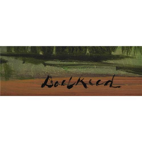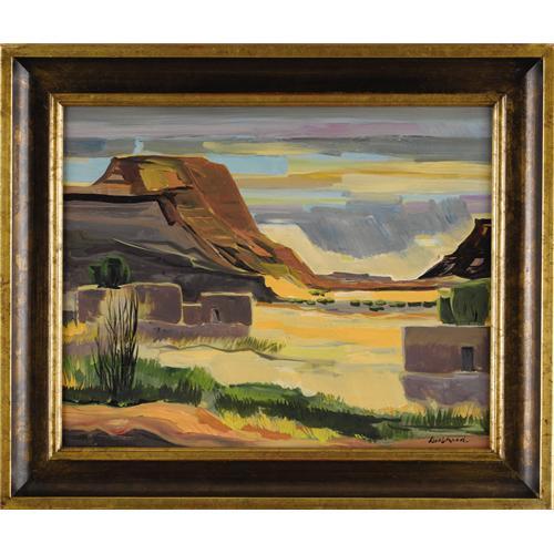 <B>DOEL REED (1895-1985)</B></I><BR>Untitled Adobes and Canyon<BR>Oil on masonite<BR>16in. x 20in.<BR>Signed lower right<BR><BR>Filled with light and color, this Doel Reed New Mexico landscape shows his mastery of form, color, and composition. Reed has distilled his objects down to their barest essentials. All forms are flattened, but by the use of overlapping lines and planes a great illusion of depth and distance is created. His use of color further reinforces the perception of depth. This painting should be viewed up close and at a distance for a true appreciation of its genius.<BR><BR> <B>Condition Report:</B> Excellent condition. New frame in excellent condition.<BR><BR><b>Shipping:</b> Requires 3rd Party Shipping (<a target="_blank" href="http://www.heritageauctions.com/common/shipping.php">view shipping information</a>)
