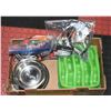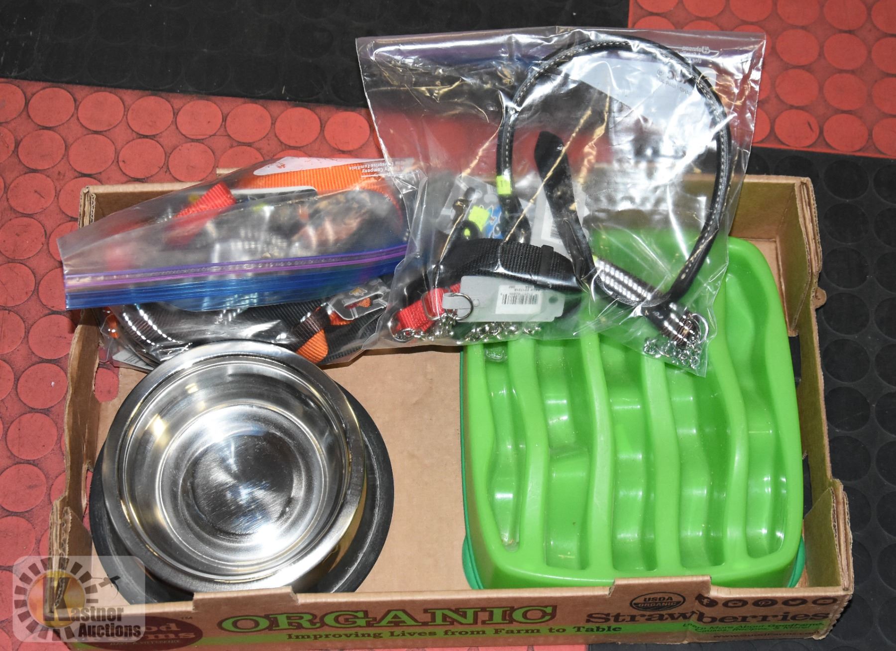 4 ASSORTED COLLARS. 5 ASSORTED LEASHES. SLOW FEEDER. 2 METAL BOWLS