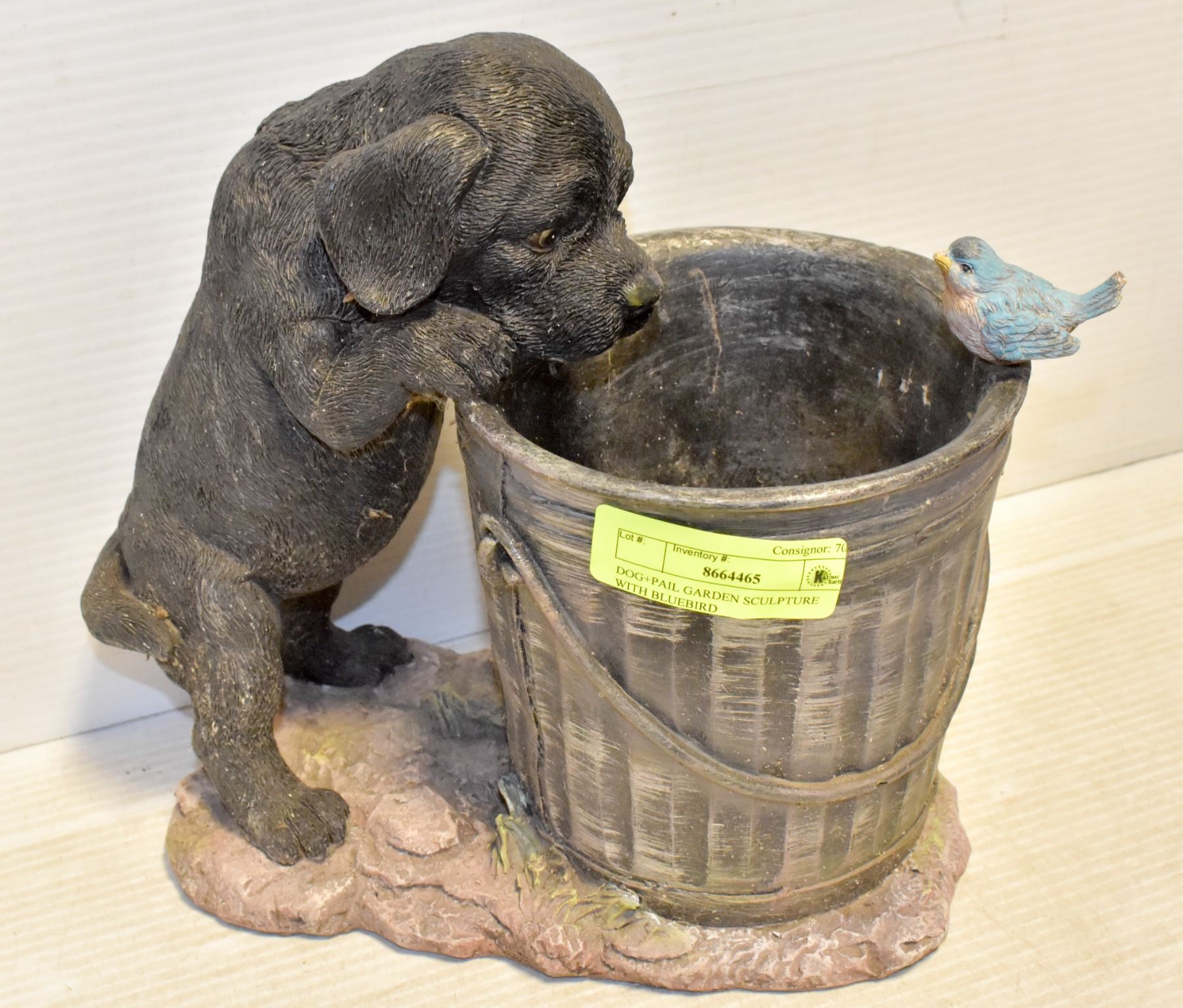 DOG+PAIL GARDEN SCULPTURE WITH BLUEBIRD