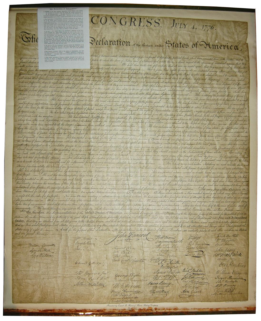 Theodore Ohman Declaration of Independence. In 1942 master lithographer Ohman created this reproduction DOI in a two-step process: the background is a photo taken of the actual Declaration. Superimposed over this is an image taken from an original Stone engraving of the Declaration. The result is a remarkably realistic copy of the document as it would appear if the original ink not faded. Measures 32.5'' x 26''. Slip of paper attached at top left margin. Upper & lower edges attached to rusting metal bars. Overall creasing & wear.