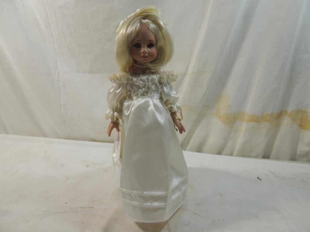 12" FULL VINYL DOLL, DECORATIVE DOLL, ON STAND, DECORATIVE LOVEE DOLL, COLLECTIBLE DOLLS, COLLECTOR AS SHOWN SEE PHOTO FOR MORE DETAILS.