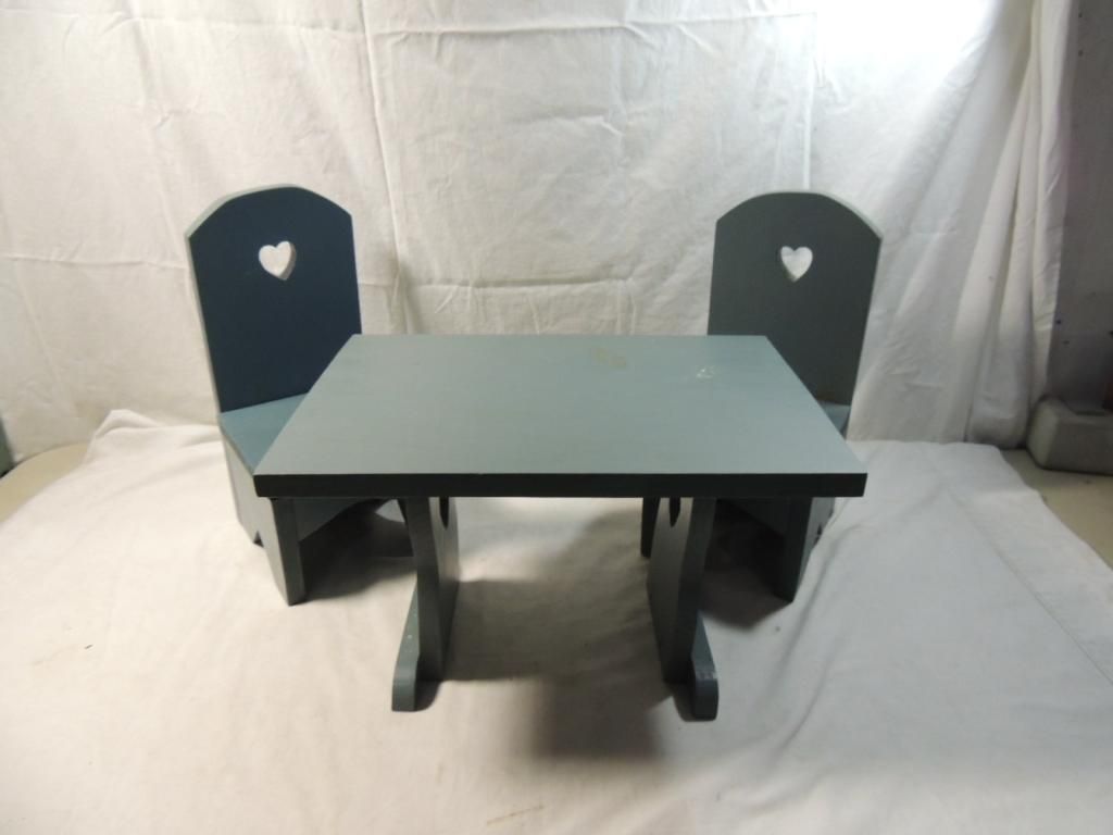 WOODEN DOLL TABLE WITH HEART CUT OUTS. WOODEN CHAIRS. TABLE AND TWO CHAIRS AS SHWON SEE PHOTO FOR MORE DETAILS.