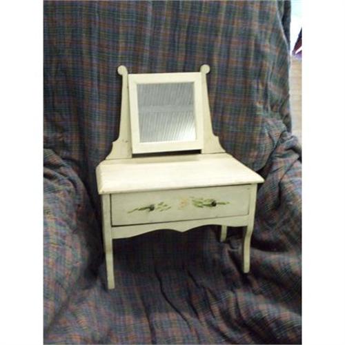 This is a vintage doll vanity with a mirror. The piece has one drawer which has a painted decoration. It appears this piece was hand made and has been played with. It is a wonderful child's toy.