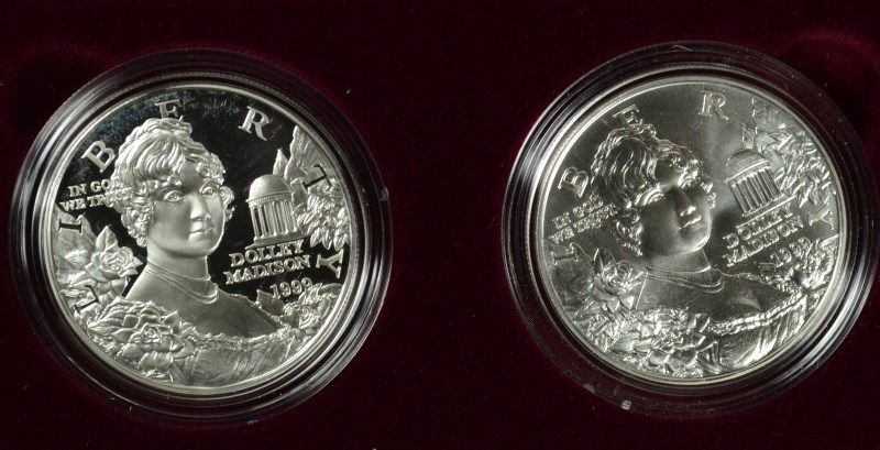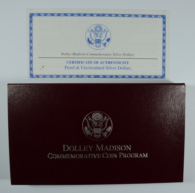 DOLLEY MADISON Pf. & UNC. COMMEM. 2 COIN SET, ORIGINAL BOX/CERTIFICATE
