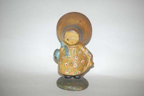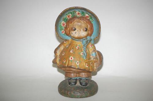 DOLLY DINGLE PAINTED DOORSTOP - CAST IRON DOLLY DINGLE PAINTED CHARACTER DOORSTOP (7 5/8" T X 4 1/2" W) - WEAR, OXIDATION, STAIN, IMPERFECTIONS