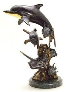 DOLPHIN & FRIENDS BRONZE SCULPTURE - 11.5"H 8"W 5 "D - GREAT ATTENTION TO DETAIL - BEAUTIFUL FINISH - LOST WAX CAST- MOUNTED ON MARBLE BASE