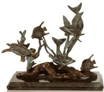DOLPHIN & SEALIFE BRONZE SCULPTURE - 8.5"H 10.5"W 5.5 "D - GREAT ATTENTION TO DETAIL - BEAUTIFUL FINISH - LOST WAX CAST- MOUNTED ON MARBLE BASE