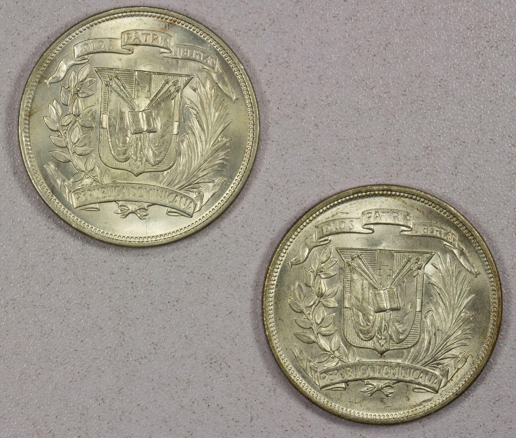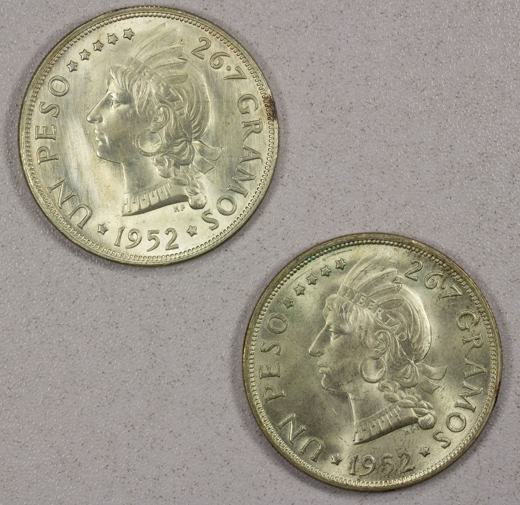 DOMINICAN REPUBLIC: LOT of 2 AR peso, 1952, KM-22, an attractive pair of this popular type; retail value $300, lot of 2 pieces, Unc.