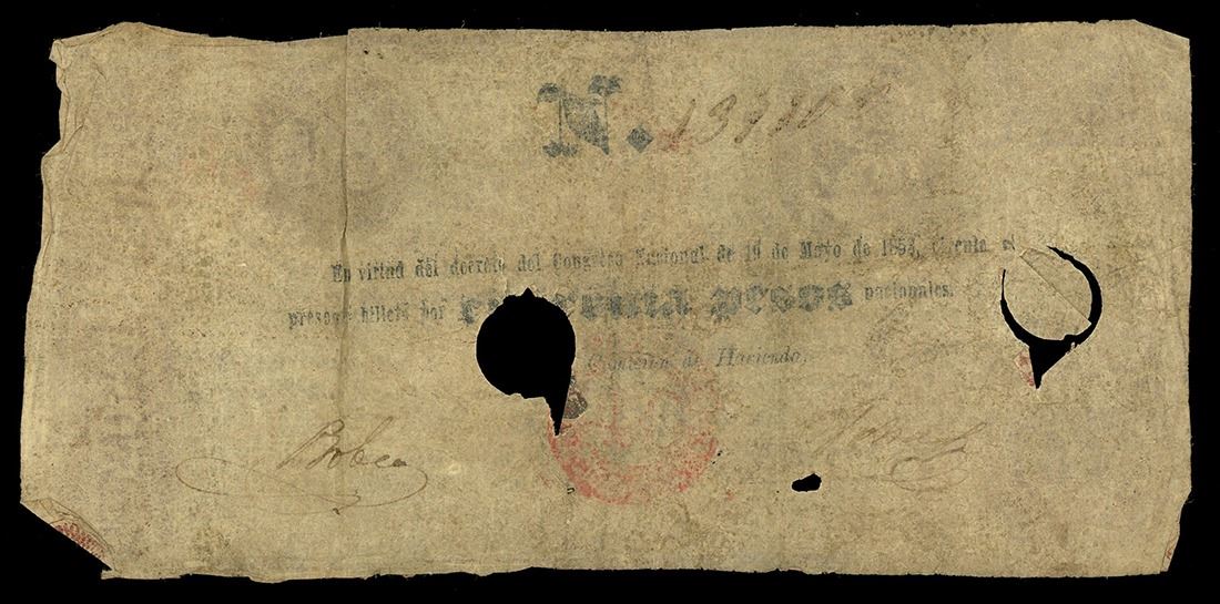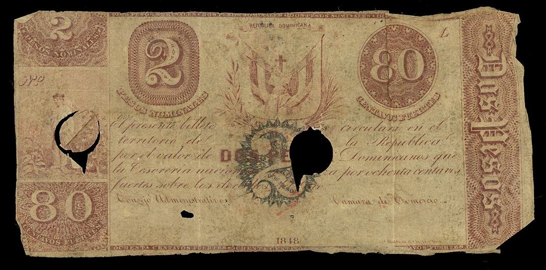 DOMINICAN REPUBLIC, República Dominicana, 40 pesos overprint of 19-5-1853 on an 1848 2 pesos nominales = 80 centavos fuertes, 1848, serial 131100. Pick-7. Fine with two circular cancellation marks, some edge-splits and small interior splits, with National Congress revaluation overprint on back.