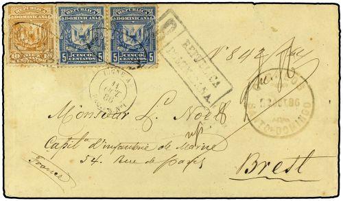 1886 STO. DOMINGO a ALEMANIA. 5 cts. azul (2) y 10 cts. bistre, carta certificada. Fechador marítimo francés LIGNE A/PAQ. FR. Nº1.