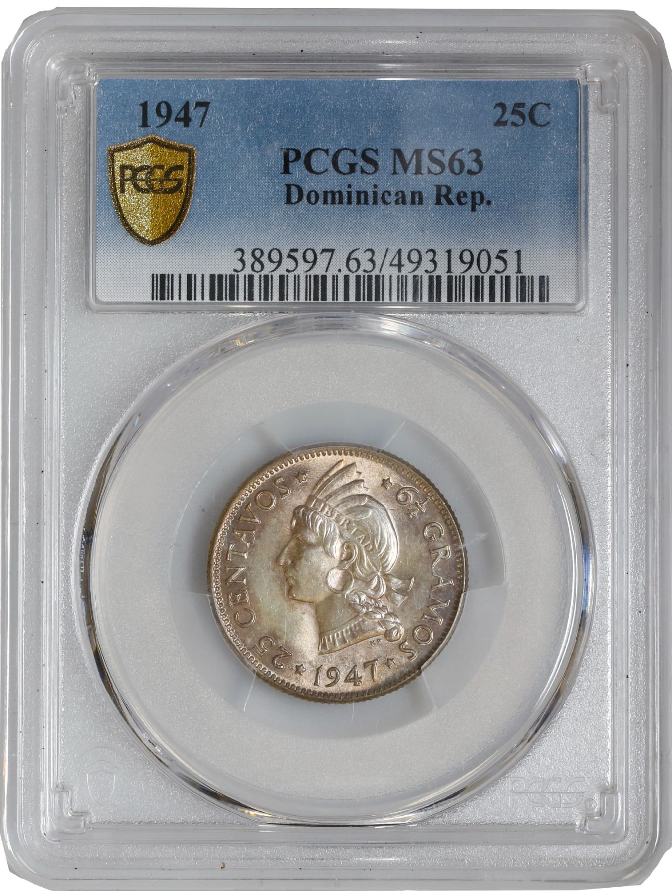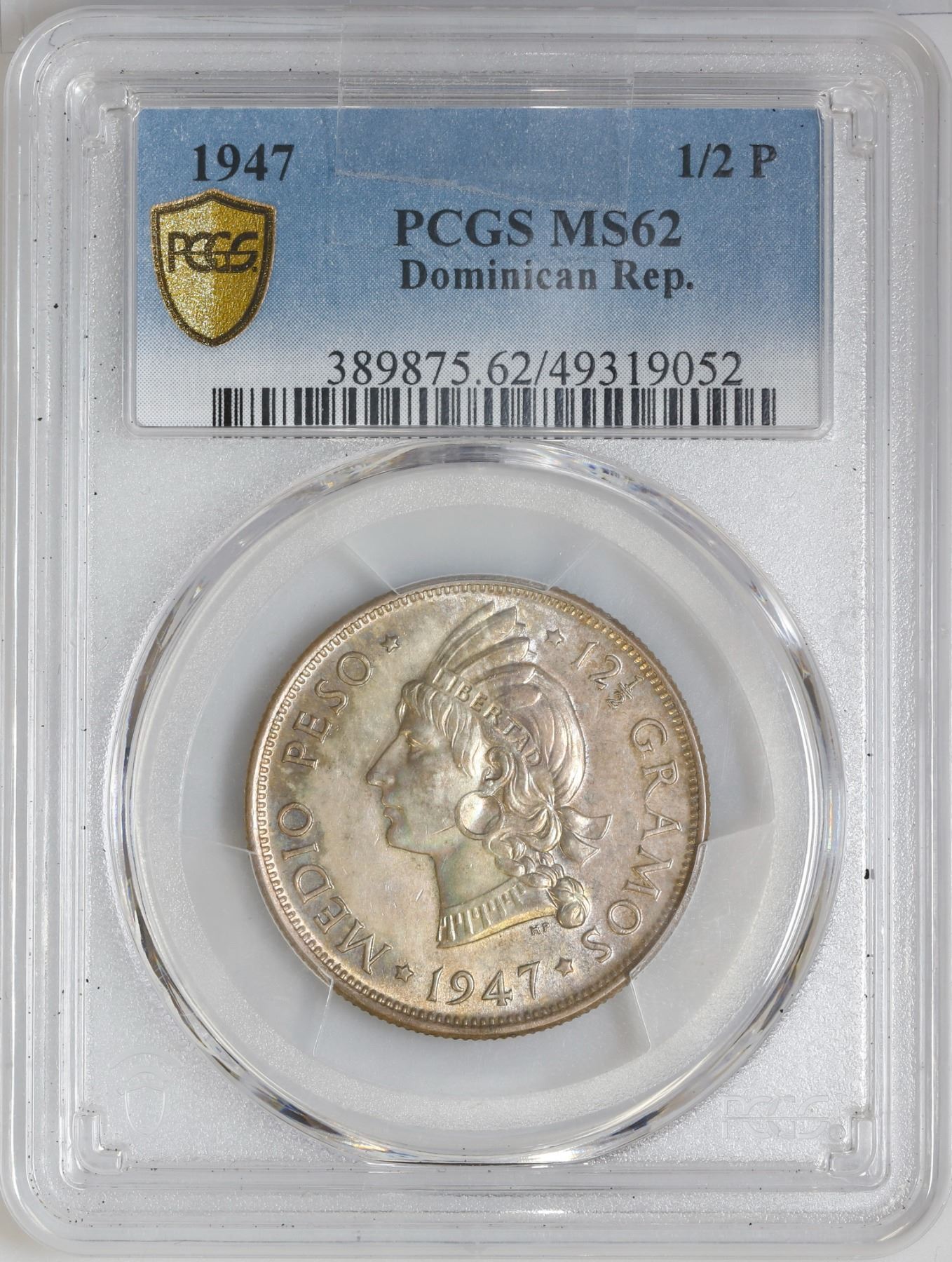 DOMINICAN REPUBLIC, lot of two coins: ½ peso and 25 centavos, both dated 1947, PCGS MS62, MS63. Both boldly struck, lustrous, and rainbow toned.