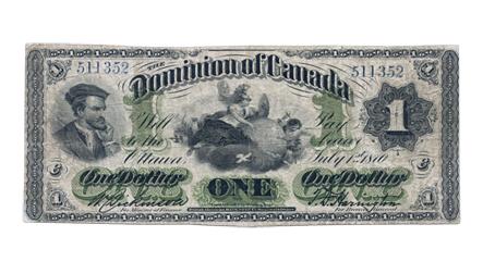 DOMINION OF CANADA. $1.00. July 1, 1870. Small Date. DC-2a. Payable at Montreal. No. 511352/C. PMG graded Fine-15. A scarce condition.