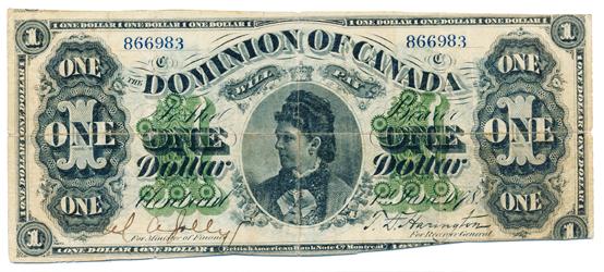 DOMINION OF CANADA. $1.00. June 1, 1878. DC-8e. No. 866983/C. Biased cut into the tint at bottom, right. An overall Very Good note.