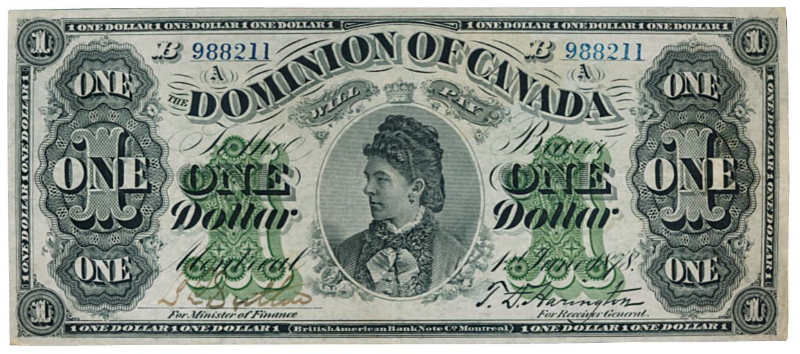 DOMINION OF CANADA. $1.00. June 1, 1878. DC-8e-ii. No. 988211/A. Series ‘A’. Lettered border. Payable at MONTREAL. Choice AU.