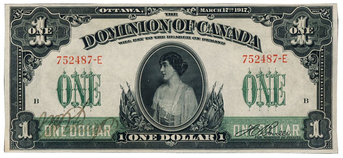 DOMINION OF CANADA. $1.00. March 17, 1917. DC-23a. No. 752487-E/B. No Seal. Boville. CCCS graded Unc-63. Bright and attractive. Crisp and clean with vibrant colours.
