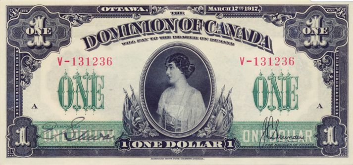DOMINION OF CANADA. $1.00. March 17, 1917. DC-23b. No. V-131236/A. No Seal. Saunders, right. A crisp AU.