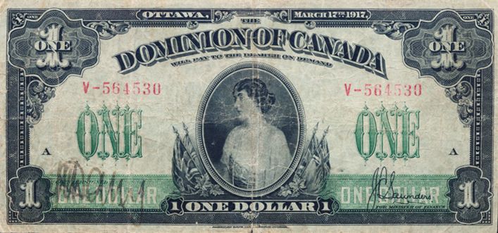 DOMINION OF CANADA. $1.00. March 17, 1917. DC-23b. No. V-564530/A. No Seal. Saunders. PMG graded Fine-15.