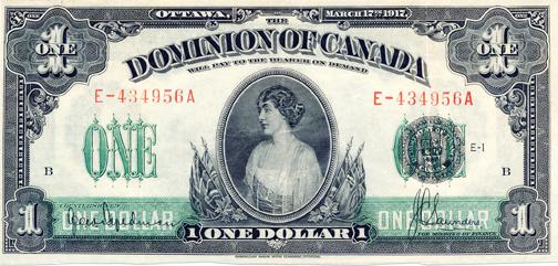 DOMINION OF CANADA. $1.00. March 17, 1917. DC-23c. Saunders, right. Seal over 'ONE'. No. E-434
