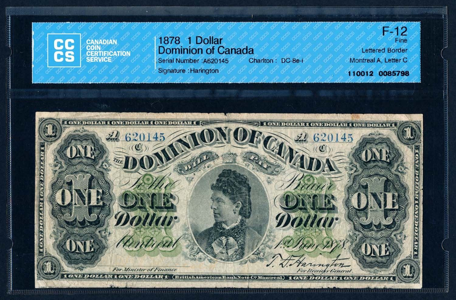 DOMINION OF CANADA 1878 $1.00, DC-8e-i Lettered Border Fine-12