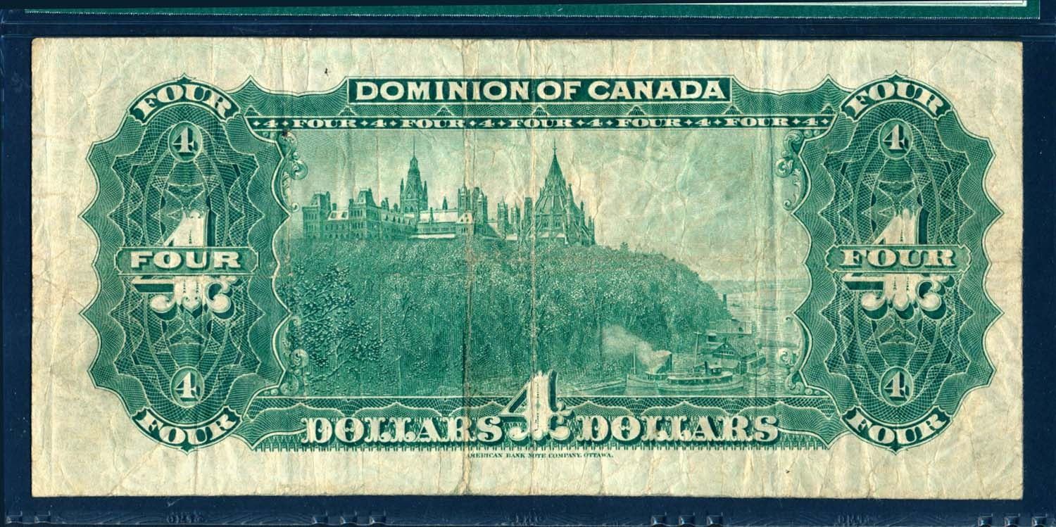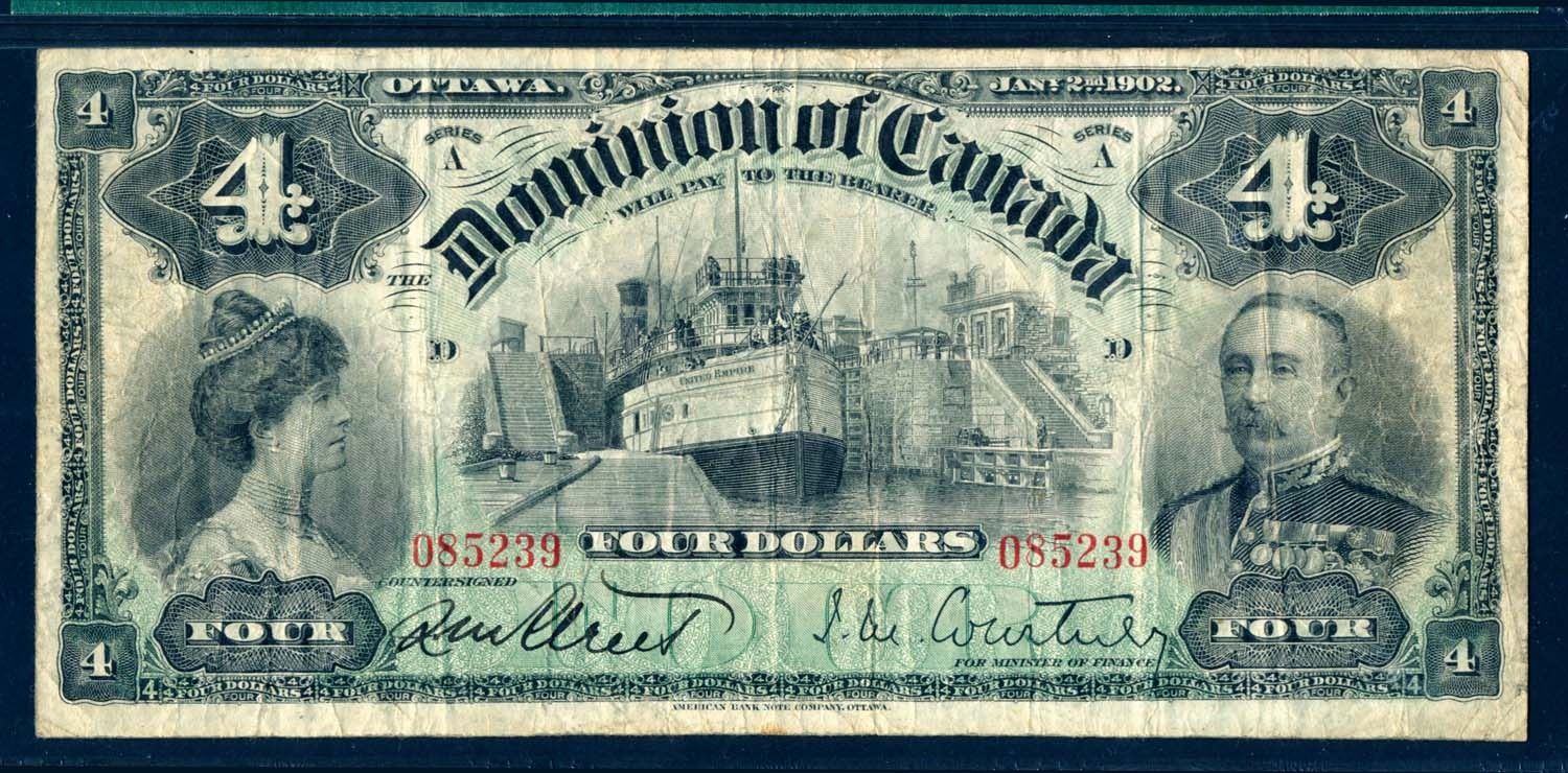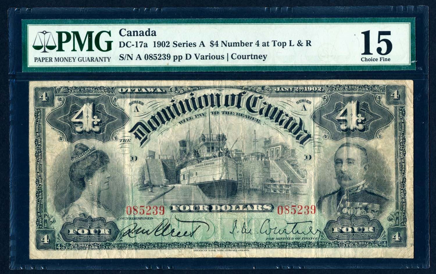DOMINION OF CANADA 1902 $4.00 DC-17a Choice Fine Number 4 at Top L & R