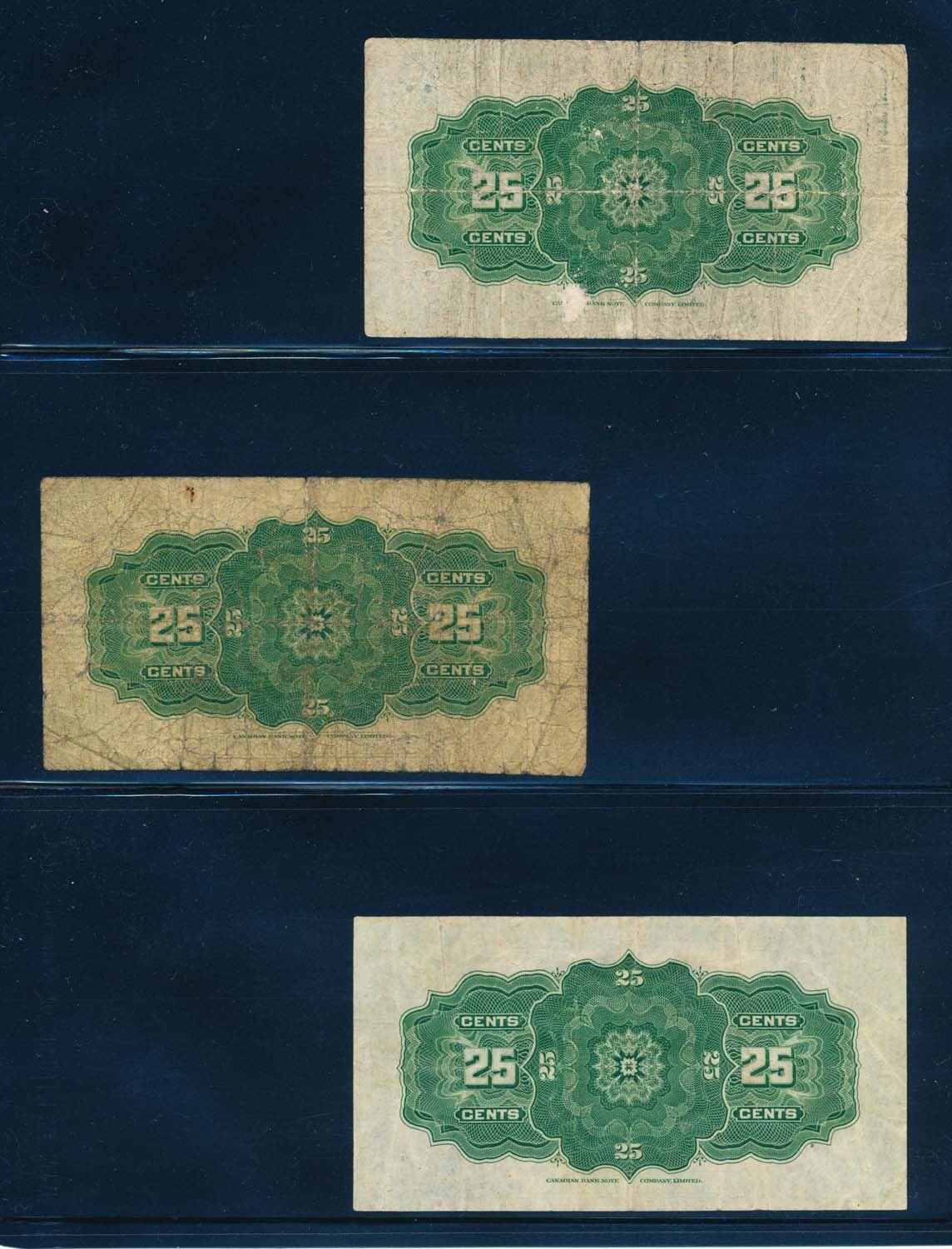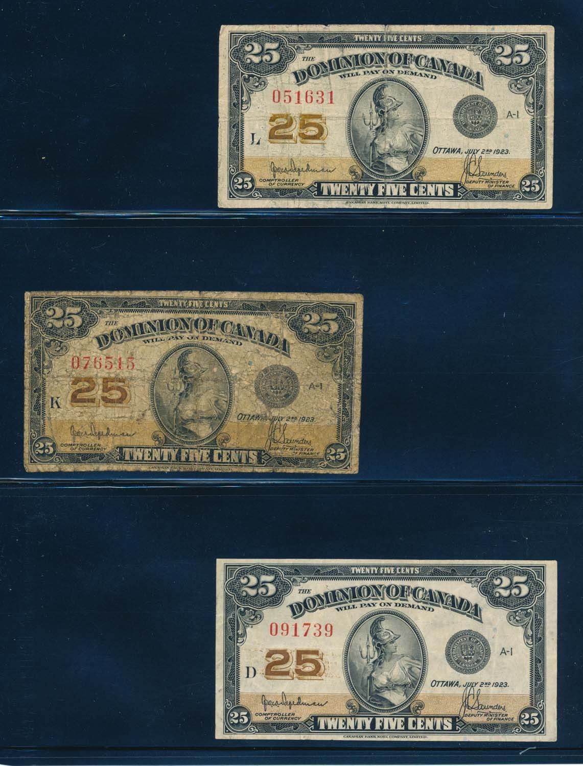 DOMINION OF CANADA 1923 25 Cents Hyndman-Saunders. Lot of 3 notes, DC-24b. VG-VF