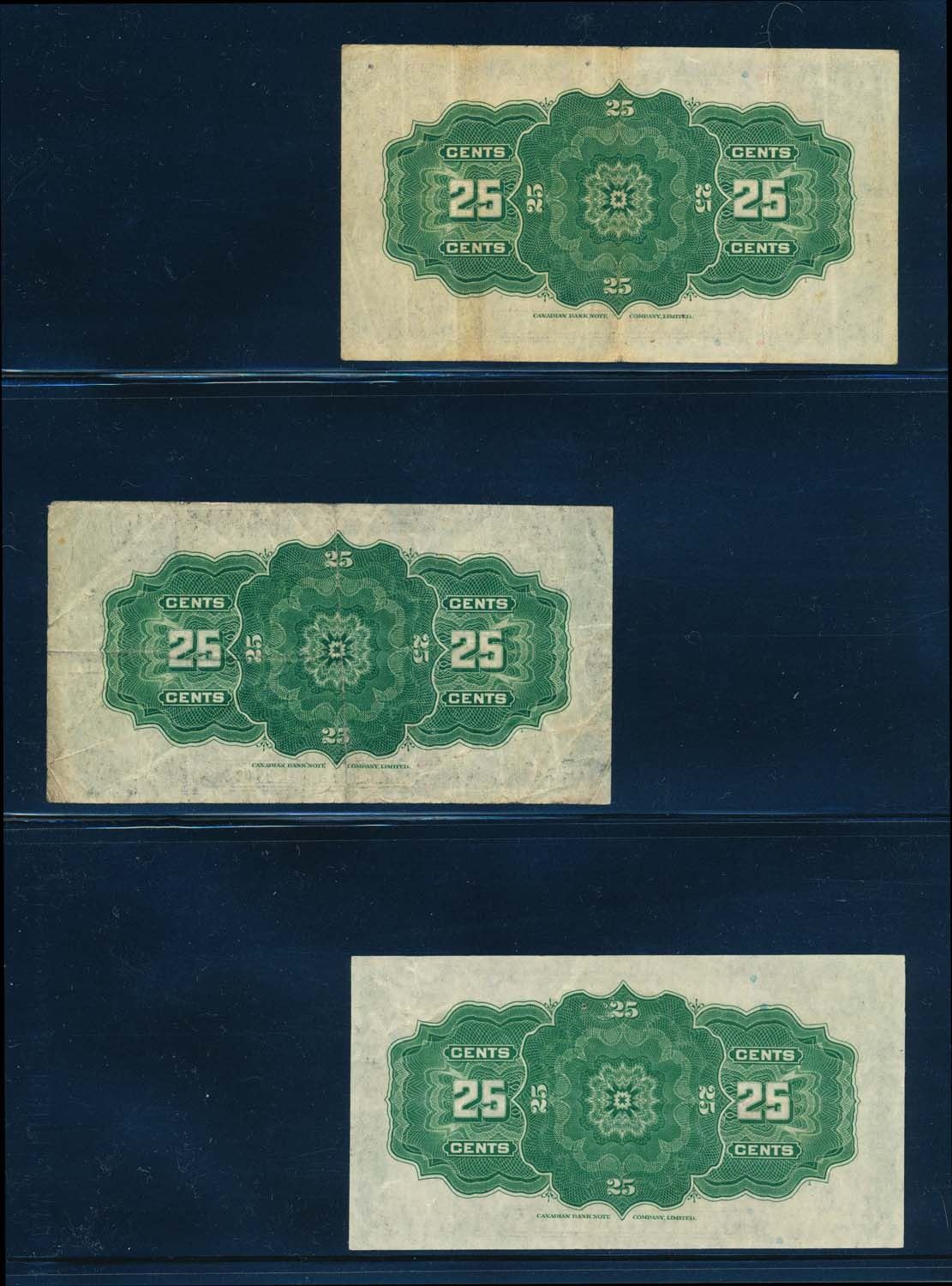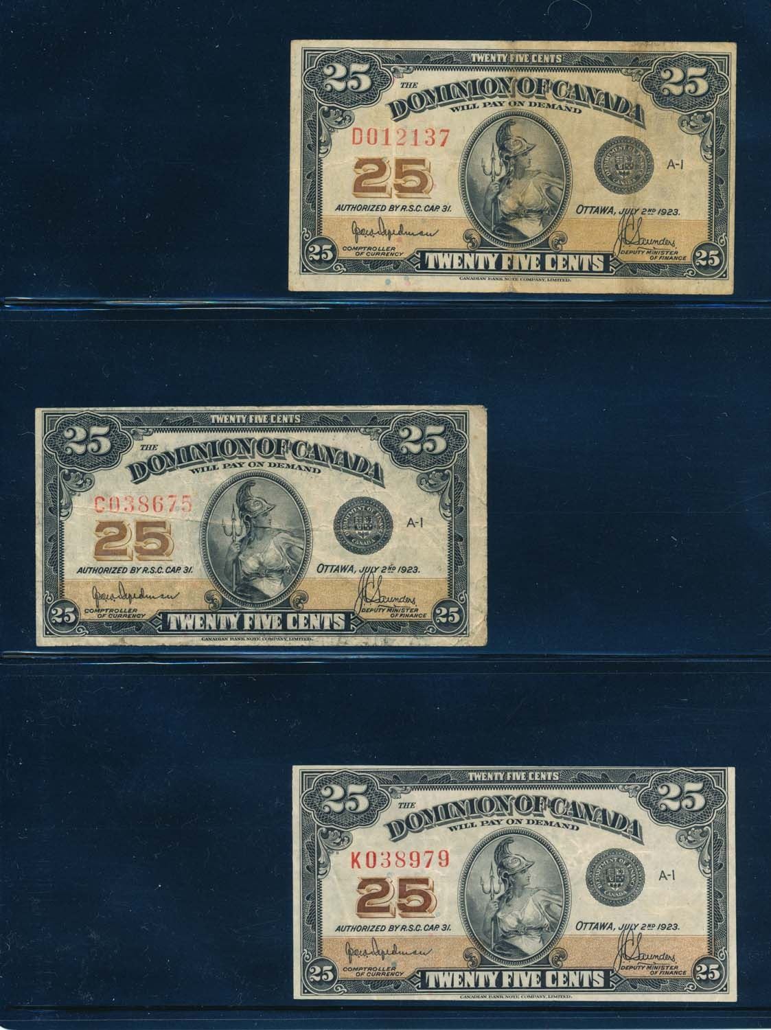 DOMINION OF CANADA 1923 25 Cents. Lot of 3 Banknotes, DC-24a. Authorized in Fine-VF