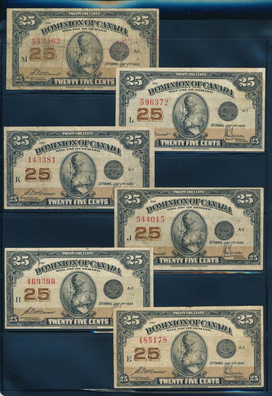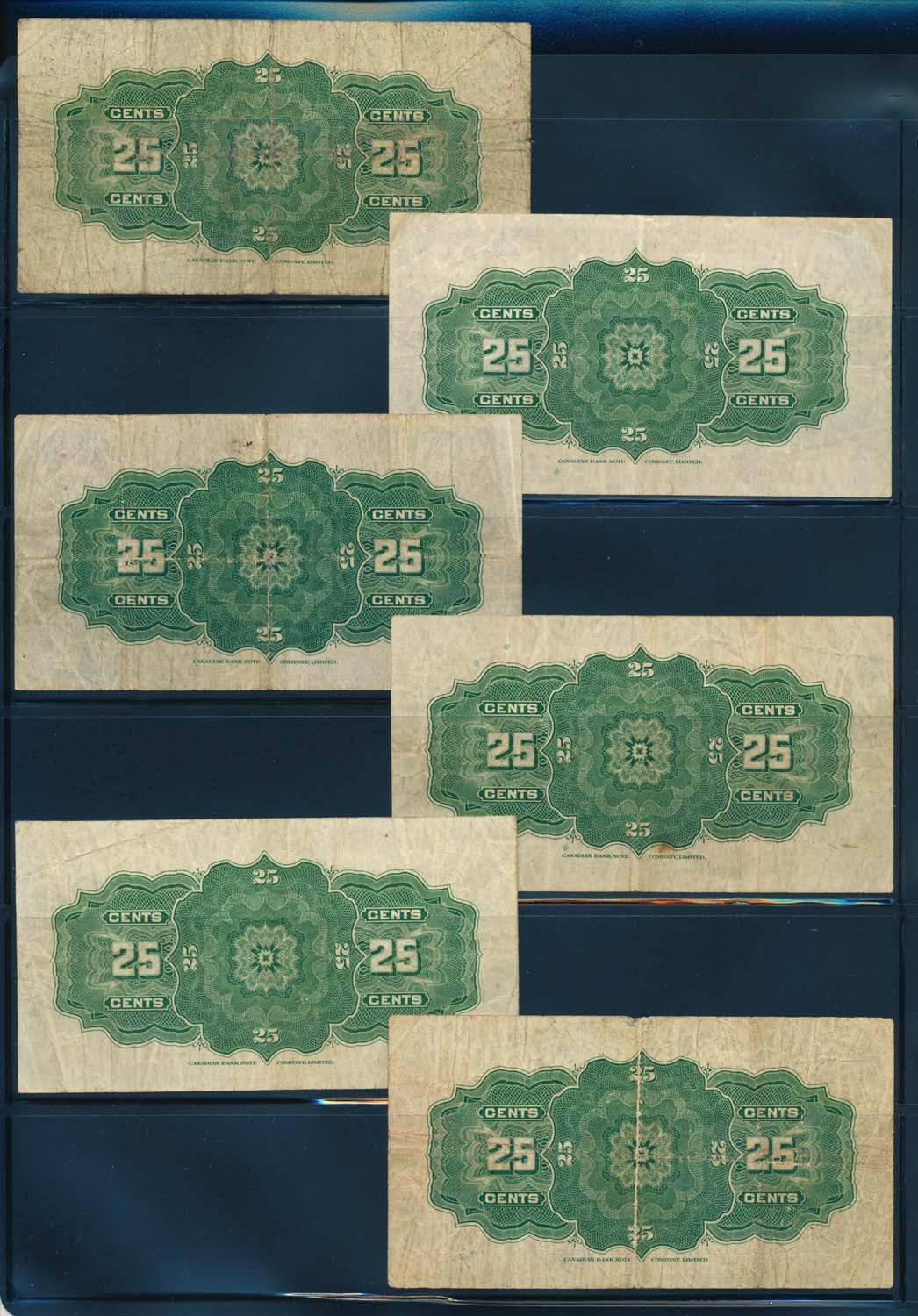 DOMINION OF CANADA 1923 25 Cents McCavour-Saunders. Lot of 6 notes, DC-24c. VG-VF