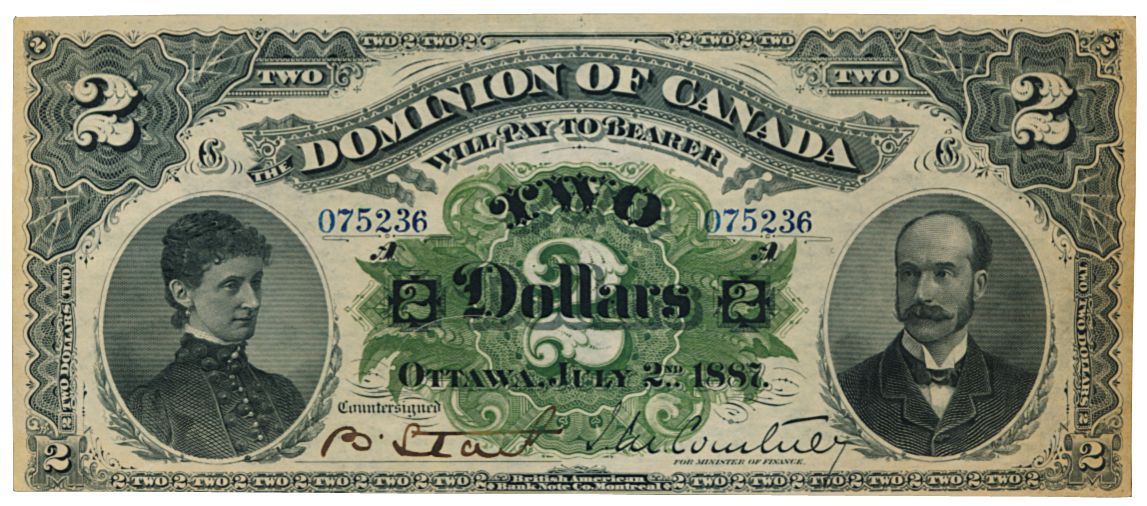 DOMINION OF CANADA. $2.00. July 2, 1887. DC-11-i. No. 075236/C. Series ‘A’. Not listed in the C.P.M.S. Registry. Sold by private treaty by Moore’s, 1980. Slight discoloration at the right and left margins. A crisp AU note. Tied for the finest surviving example.