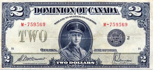 DOMINION OF CANADA. $2.00. June 23, 1923. DC-26f. Black Seal. No. M-759569/B. Fine.