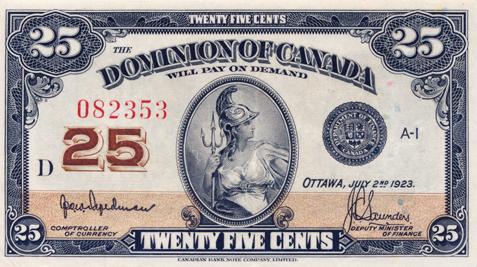 DOMINION OF CANADA. 25 CENTS. July 2, 1923. DC-24a. Hyndman-Saunders. No. 'Authorized, etc.' N