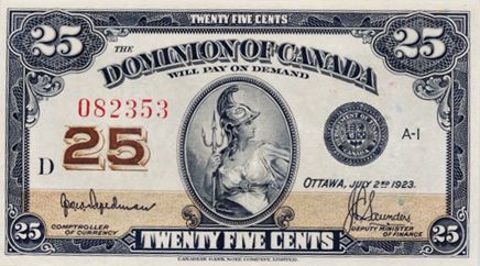 DOMINION OF CANADA. 25 CENTS. July 2, 1923. DC-24a. Hyndman-Saunders. No ‘Authorized, etc.’. No. D08