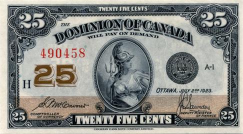 DOMINION OF CANADA. 25 CENTS. July 2, 1923. DC-24c. McCavour-Saunders. No. 490458. Check letter 'H'. Choice Unc-63.