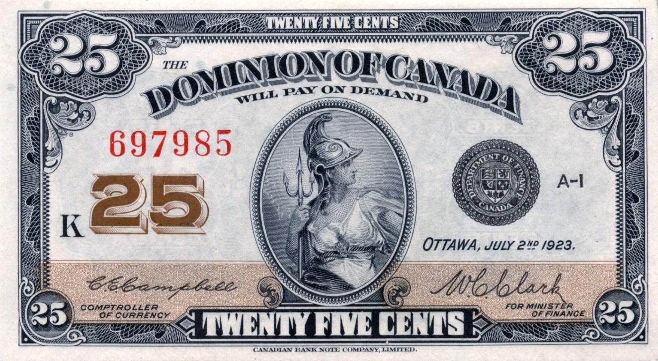 DOMINION OF CANADA. 25 CENTS. July 2, 1923. DC-24d. Campbell-Clark. No. 697985. Check letter 'K'. Choice Unc-63.
