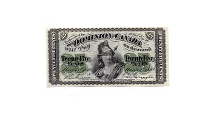 DOMINION OF CANADA. 25 CENTS, March 1, 1870-A. DC-1a. A bright and choice AU+. An example cut from an original sheet approximately ten years ago.