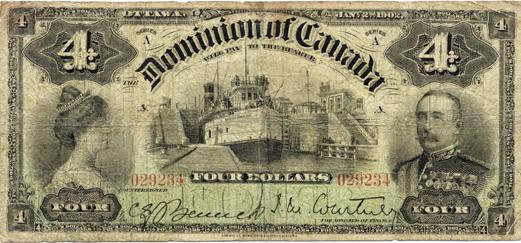 DOMINION OF CANADA. $4.00. Jan. 2, 1902. DC-17a. ‘4’ at top. No. 029234. PMG graded Very Good-10.