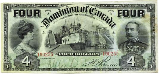 DOMINION OF CANADA. $4.00. Jan. 2, 1902. DC-17b. ‘FOUR’s’ at top. No. 190255/A. PMG graded Very Fine-30.