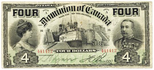 DOMINION OF CANADA. $4.00. Jan. 2, 1902. DC-17b. ‘FOUR’s’ at top. No. 441412/B. PMG graded FINE-15.