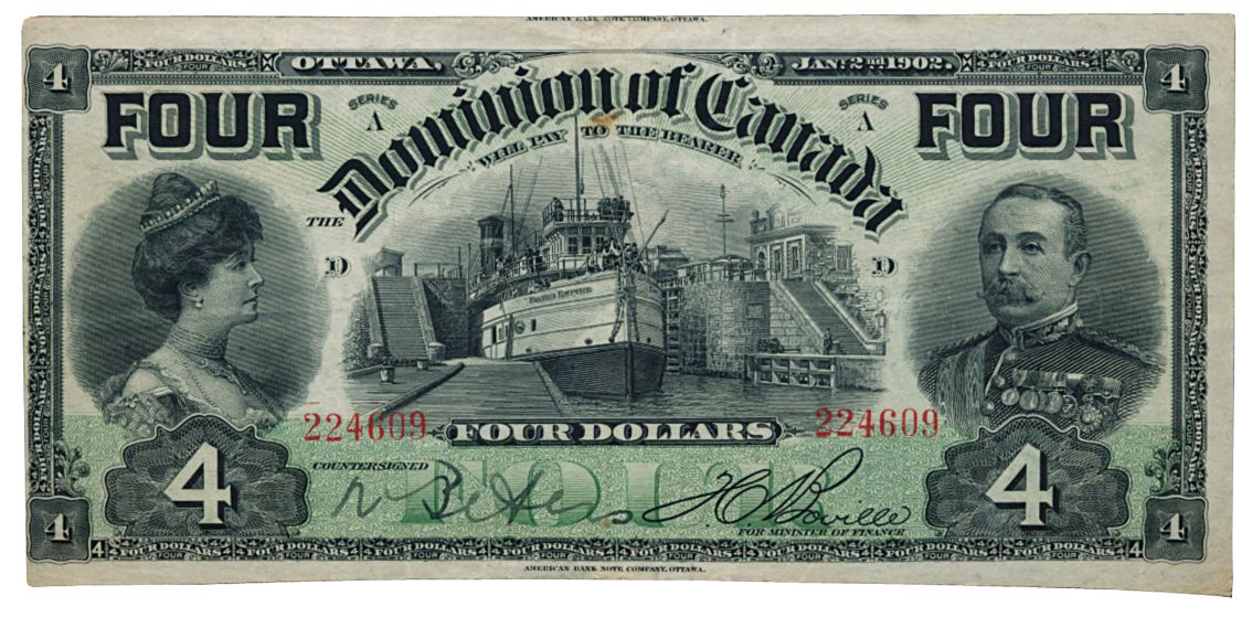 DOMINION OF CANADA. $4.00. Jan. 2, 1902. DC-17b. No. 450791/D. Boville. PMG graded Fine-15. Net. Designated with tape repair and stains.