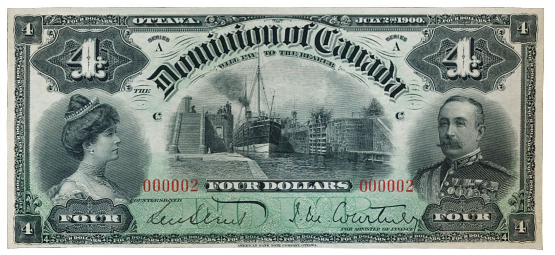 DOMINION OF CANADA. $4.00. July 2, 1900. DC-16. No. 000002/C. Vignette of the Sault Ste. Marie/U.S. locks. From the James E. Charlton/Canadian Numismatic Association 1959 convention auction. Tied for the finest surviving example. A rare low serial numbered note. AU.
