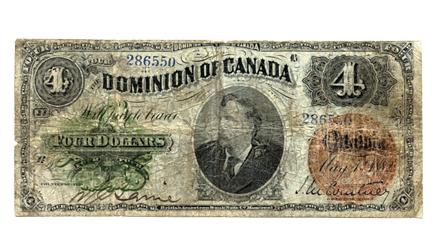 DOMINION OF CANADA. $4.00. May 1, 882. DC-10. No. 286550/B. PMG graded Fine-12.