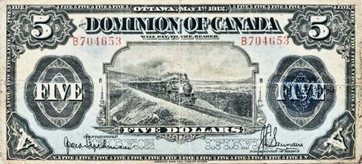 DOMINION OF CANADA. $5.00. May 1, 1912. DC-12e. Hyndman-Saunders. Seal over FIVE. No. B704563. PMG graded FINE-12 net. Splits in paper.