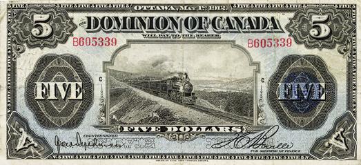 DOMINION OF CANADA. $5.00. May 1, 1912. DC-21d. Hyndman-Boville. Seal over FIVE. No. B605339. PMG graded Very Fine-20.