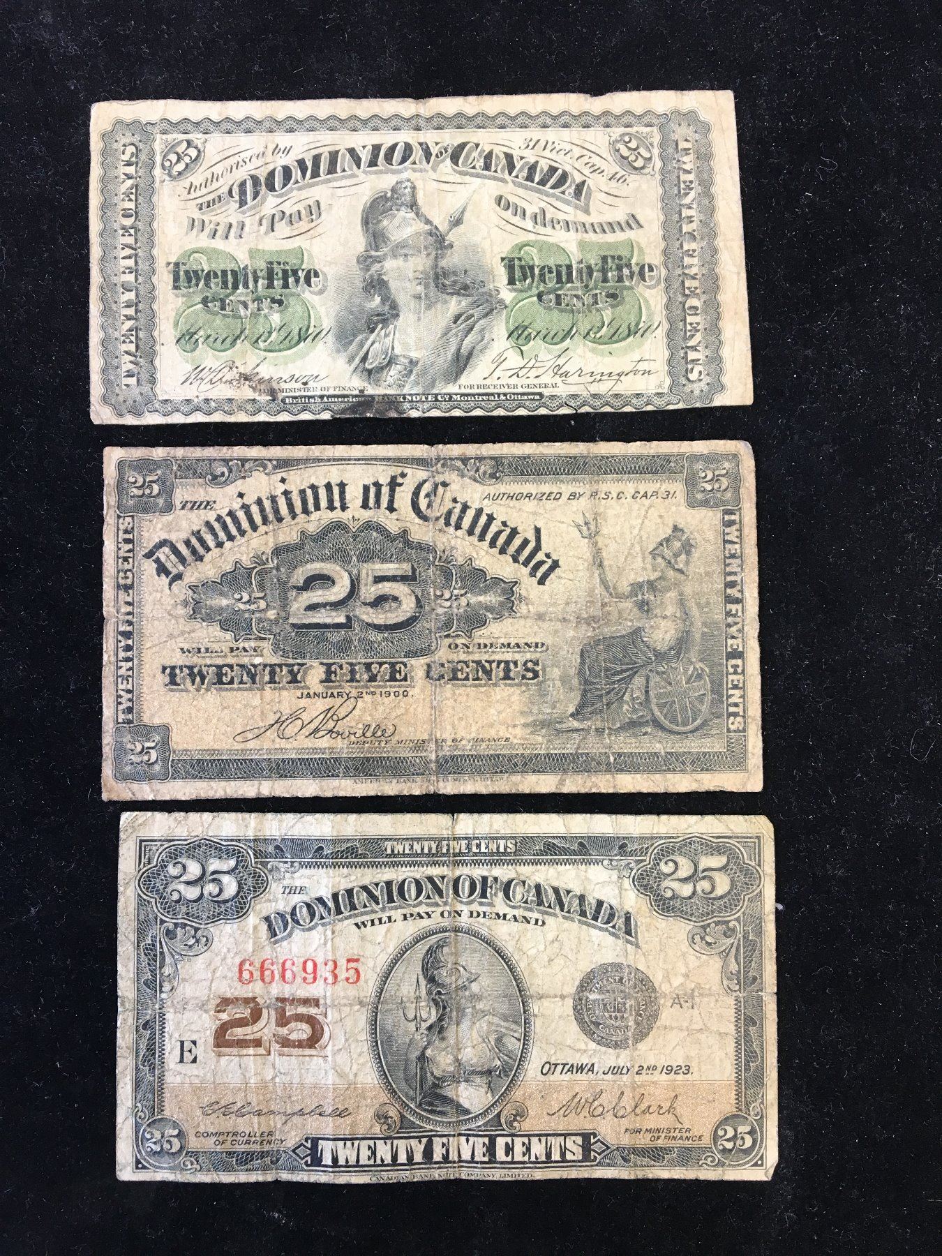 NICE LOT OF 3 FRACTIONAL 25 CENT NOTES! 1870,1900,1923.AVERAGE VG